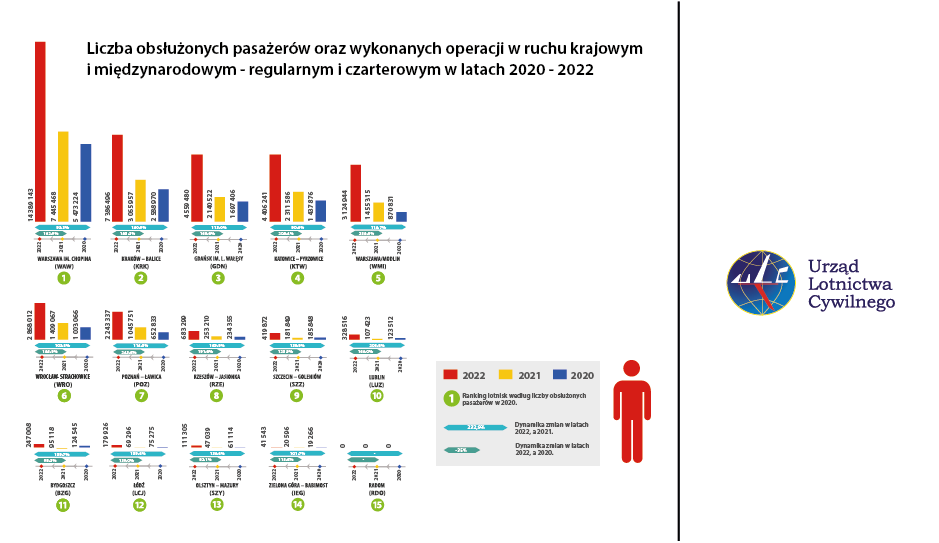 W 2022 roku w polskich portach lotniczych obsłużono prawie 41 mln pasażerów – ponad dwa razy więcej niż w roku 2021 r. i o 16 proc. mniej niż w 2019 roku. Mimo agresji zbrojnej na Ukrainę oraz idących za tym zmian, takich jak rosnąca inflacja, wysokie ceny paliw, czy też brak możliwości wykonywania przelotów nad terytorium Ukrainy i Rosji, ruch lotniczy w Polsce systematycznie się odbudowywał.
