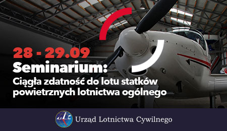 Zapraszamy do udziału w seminarium pt. „Ciągła zdatność do lotu statków powietrznych lotnictwa ogólnego”, które odbędzie się w dniach 28 - 29 września 2021 roku w PWSZ w Chełmie. Z uwagi na aktualną sytuację epidemiczną, seminarium odbędzie się w formie hybrydowej, tj. stacjonarnie w Państwowej Wyższej Szkole Zawodowej w Chełmie przy ul. Wojsławickiej 8b oraz zdalnie w formie telekonferencji.