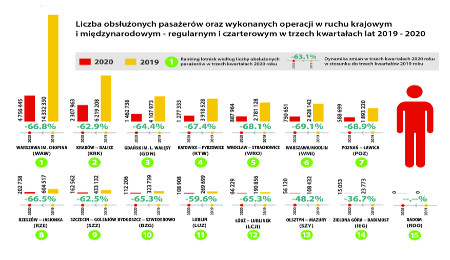 W pierwszych trzech kwartałach 2020 roku polskie porty lotnicze obsłużyły 12,8 mln pasażerów a więc o 66 proc. mniej niż w analogicznym okresie poprzedniego roku. Zrealizowano 128 tys. operacji lotniczych, co oznacza spadek o 58 proc. w stosunku do pierwszych trzech kwartałów 2019 roku.