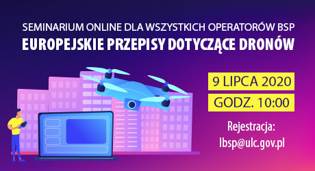 Urząd Lotnictwa Cywilnego zaprasza operatorów bezzałogowych statków powietrznych na seminarium online, które odbędzie się 9 lipca 2020 r. Podczas seminarium zostaną omówione europejskie przepisy dotyczące dronów, które będą stosowane od 31 grudnia 2020 r.