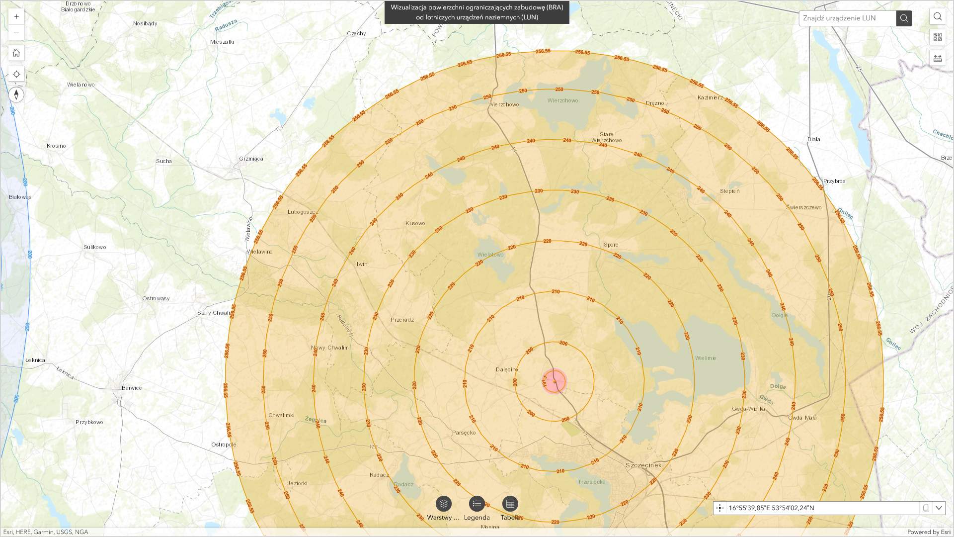 Uwaga: inwestycje położone w odległości większej niż 600 m od lotniczego urządzenia naziemnego, których wysokość całkowita wyrażona w metrach nad poziomem morza nie przekracza dopuszczalnych wartości reprezentowanych przez okręgi przedstawiające ograniczenia wysokości zabudowy od lotniczych urządzeń naziemnych, nie wymagają uzgadniania z Prezesem ULC.
